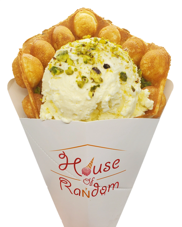 A unique saffron and rose water infused authentic Iranian ice cream topped off with pistachios